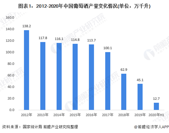 國家統計局數據披露,2012-2019年,我國葡萄酒產量逐年下降。2019年,我國葡萄酒產量為4.51億升,較2018年下滑28.30%。2020年上半年,我國葡萄酒產量繼續走低,僅為1.27億升。