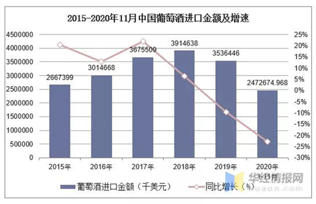2015-2020年11月中國葡萄酒進口金額及增速